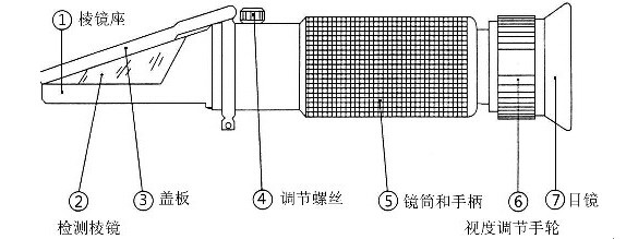 1)將折光棱鏡對準光亮方向,調(diào)節(jié)⑥目鏡視度環(huán),直到標線清晰為止;